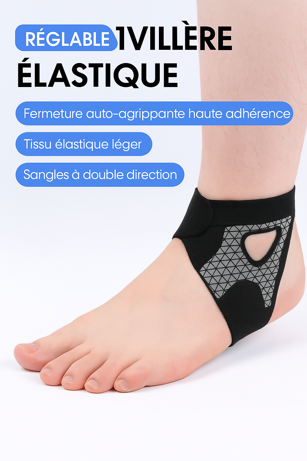 Équipée de sangles à double direction et de fermetures auto-agrippantes à haute tenue pour assurer un maintien complet et sécurisé de la cheville.